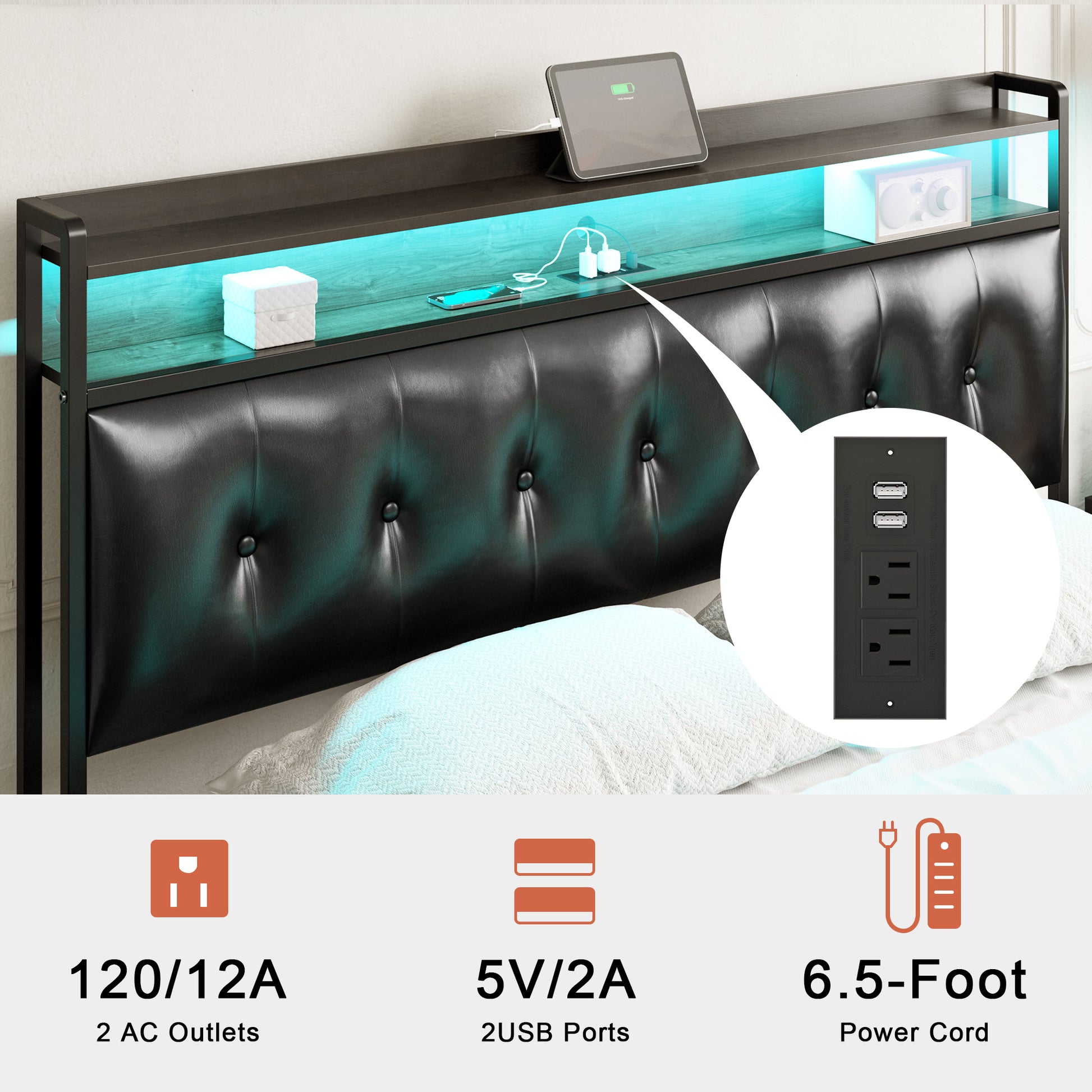 - Convenience At Your Fingertips. Storage headboard with charging station, 2 standard plug outlets and 2 USB ports with cable management 6.5 ft power cord. Keep frequently used items such as cell phones, tablets and glasses within easy reach.